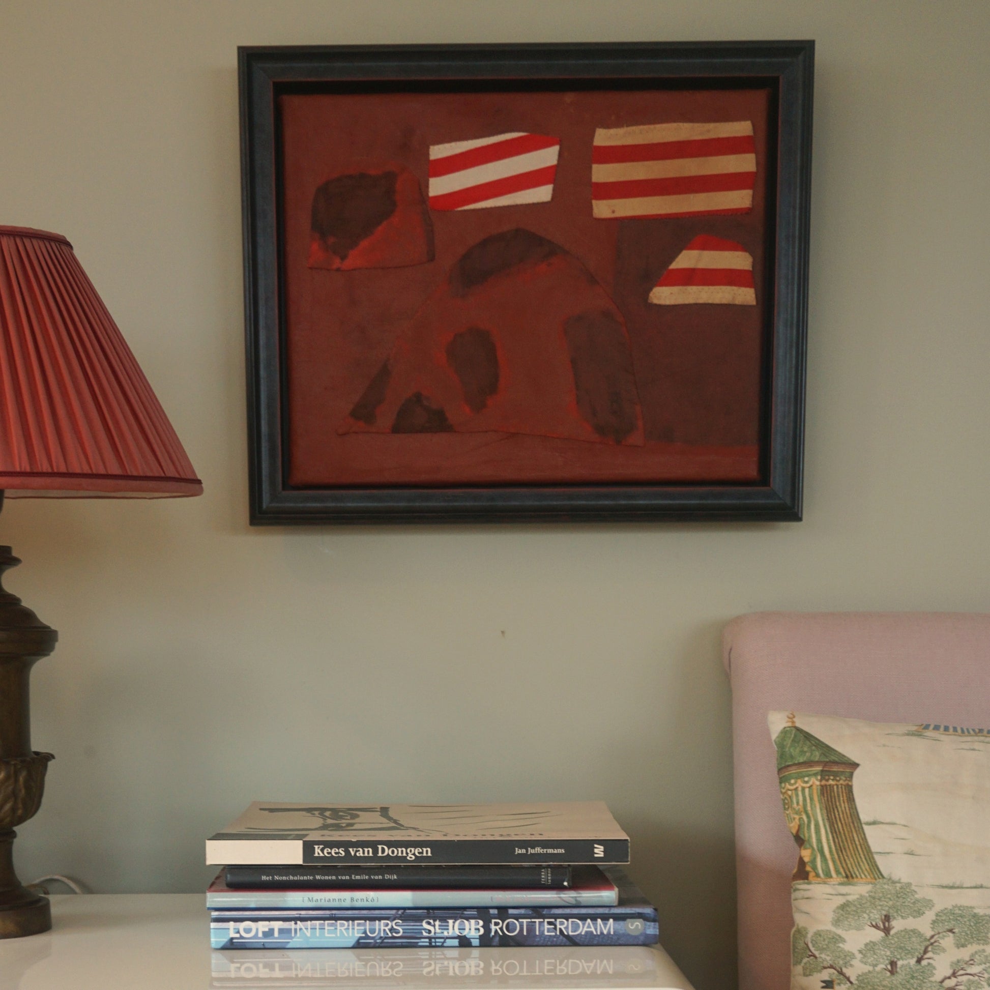 An oil painting on stretched linen with cotton patches appliqué by hand, by artist and Greek Spaces founder Vicky Pylorides.
