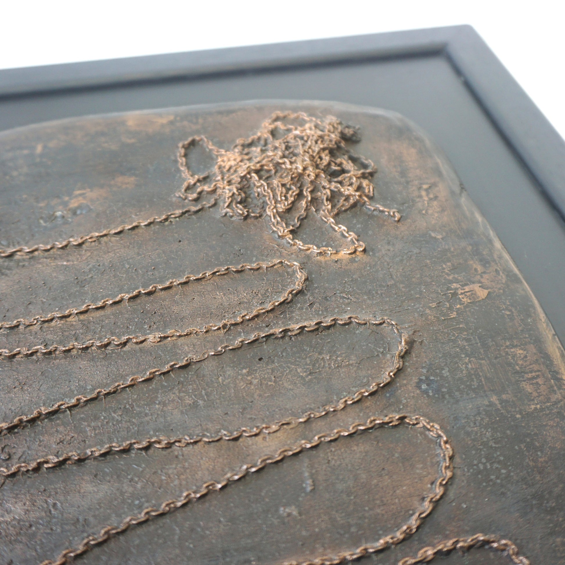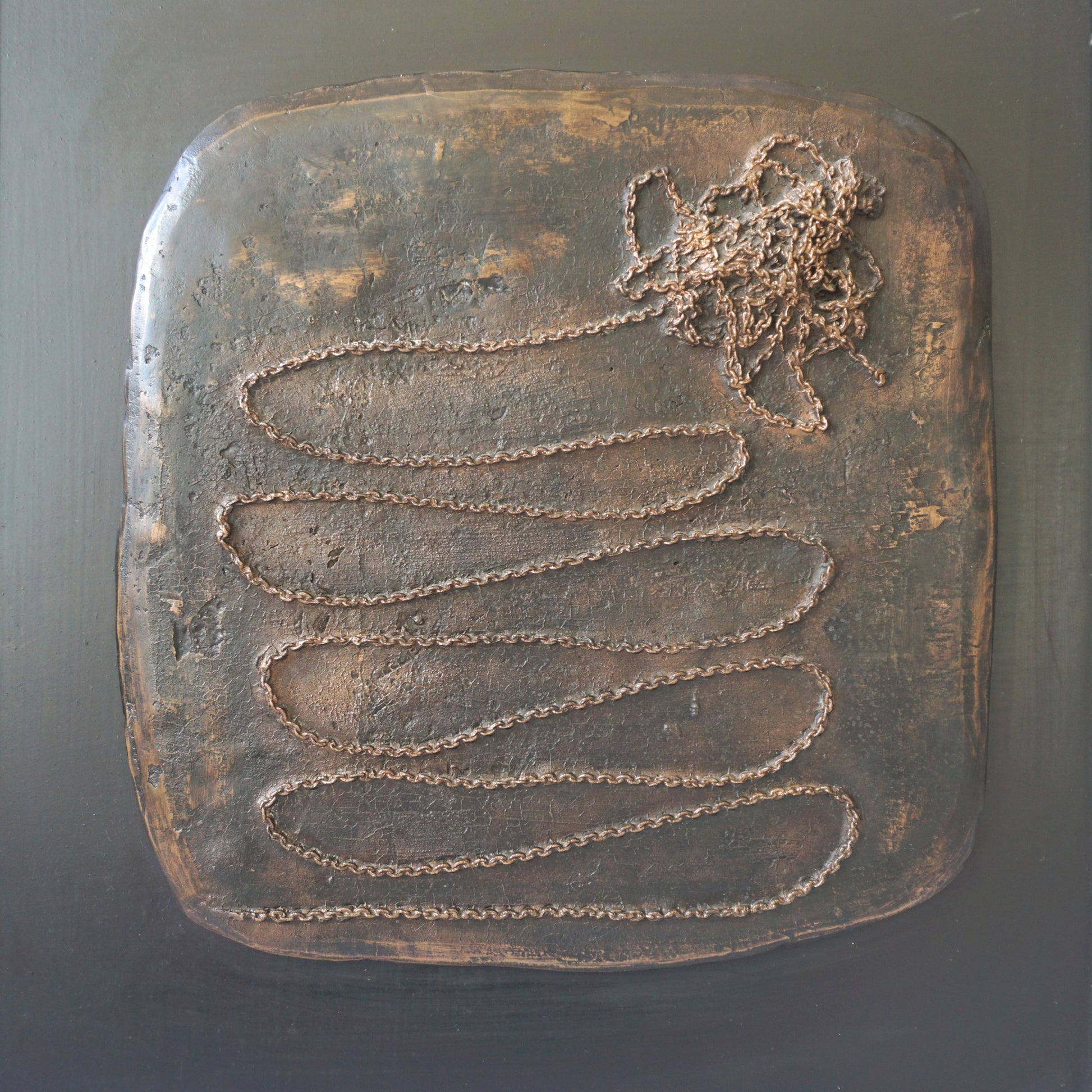 Bronze chain embedded in bronze surface on wood board by Dutch artist Joop Snoep.