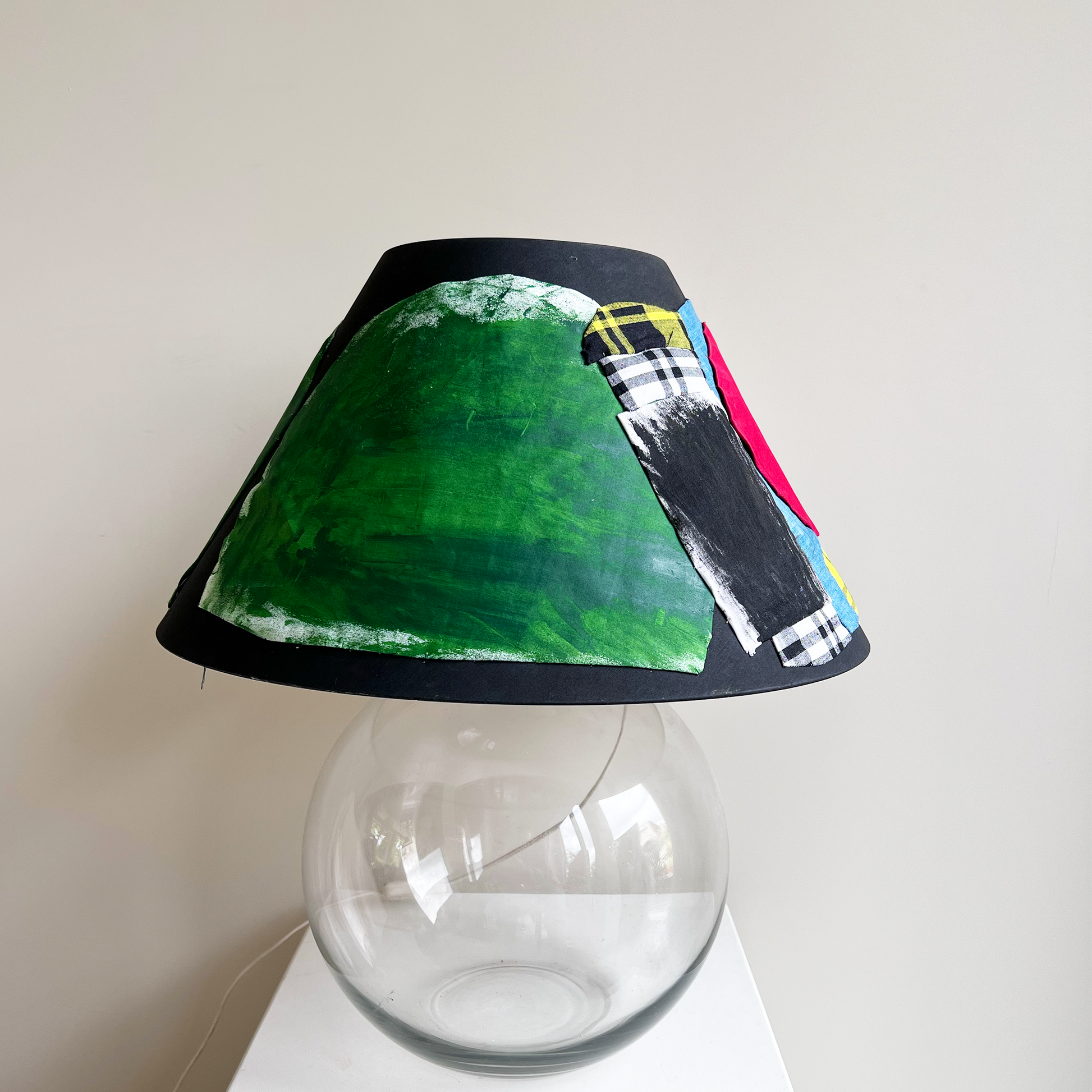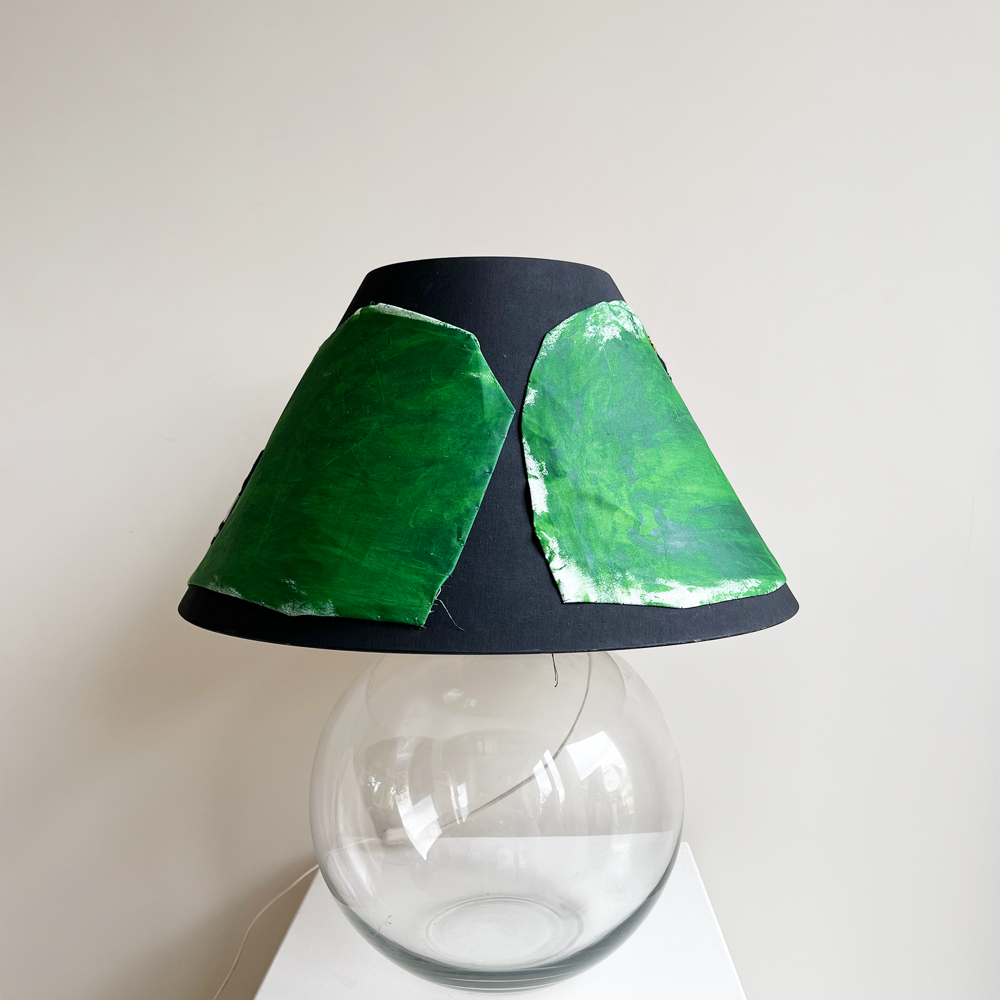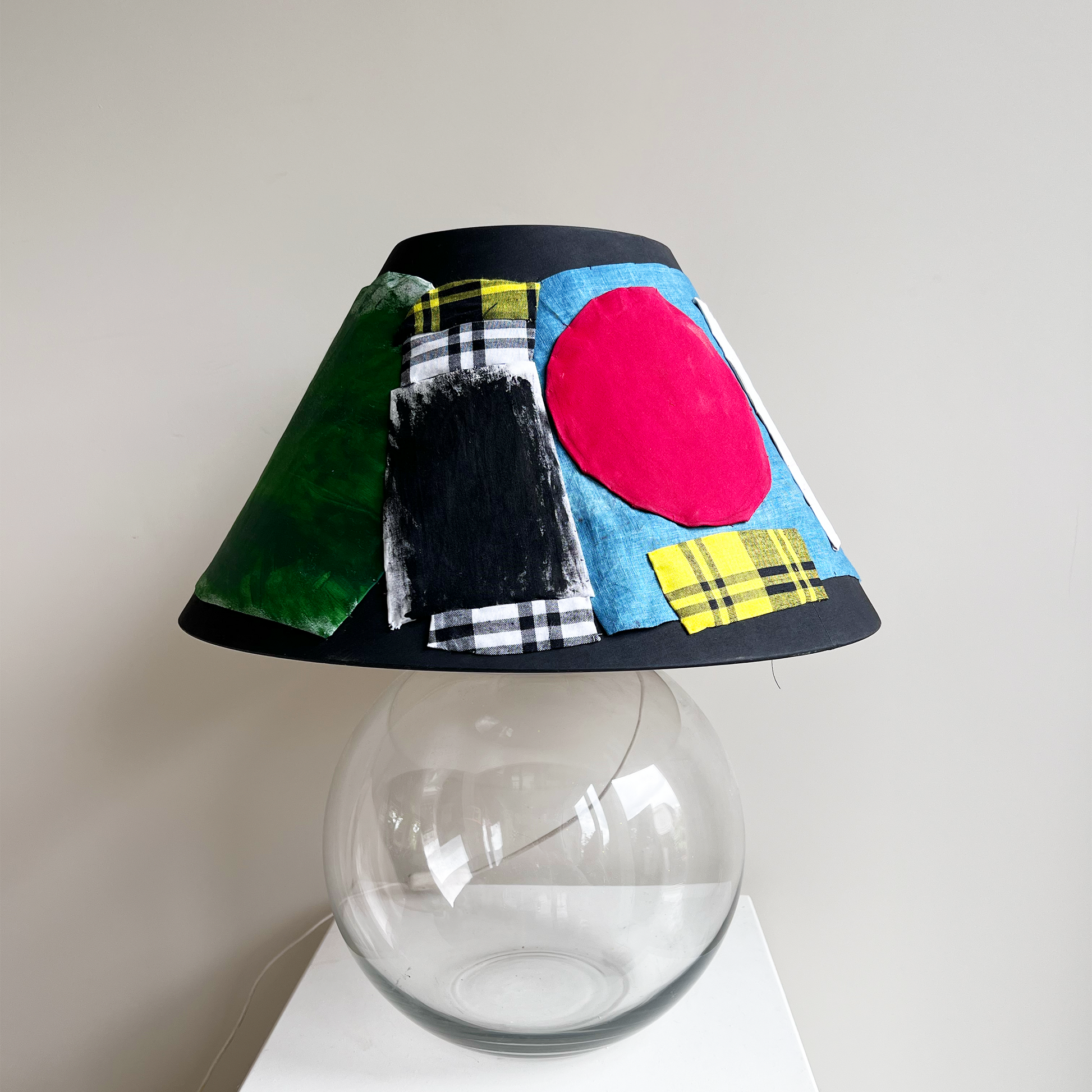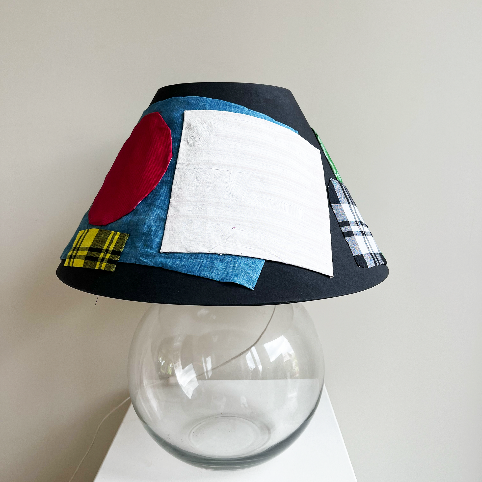 Hand-painted black lampshade with a variety of textiles patches applied by applique technique.