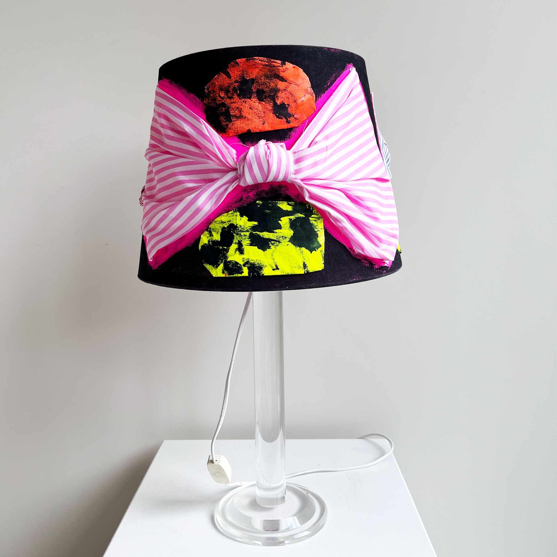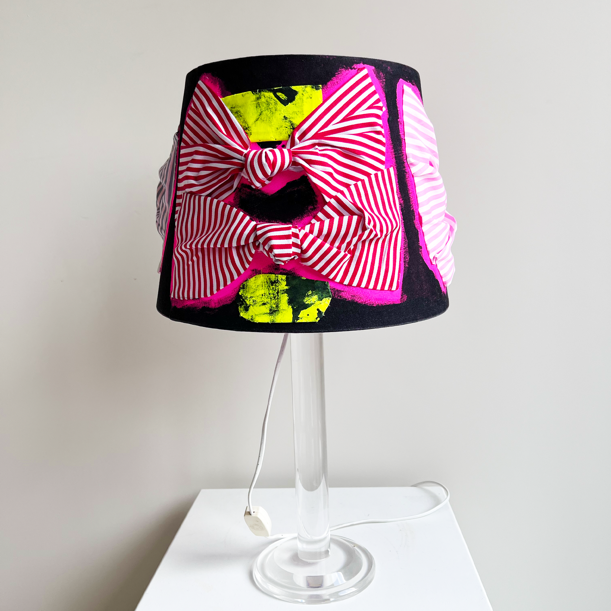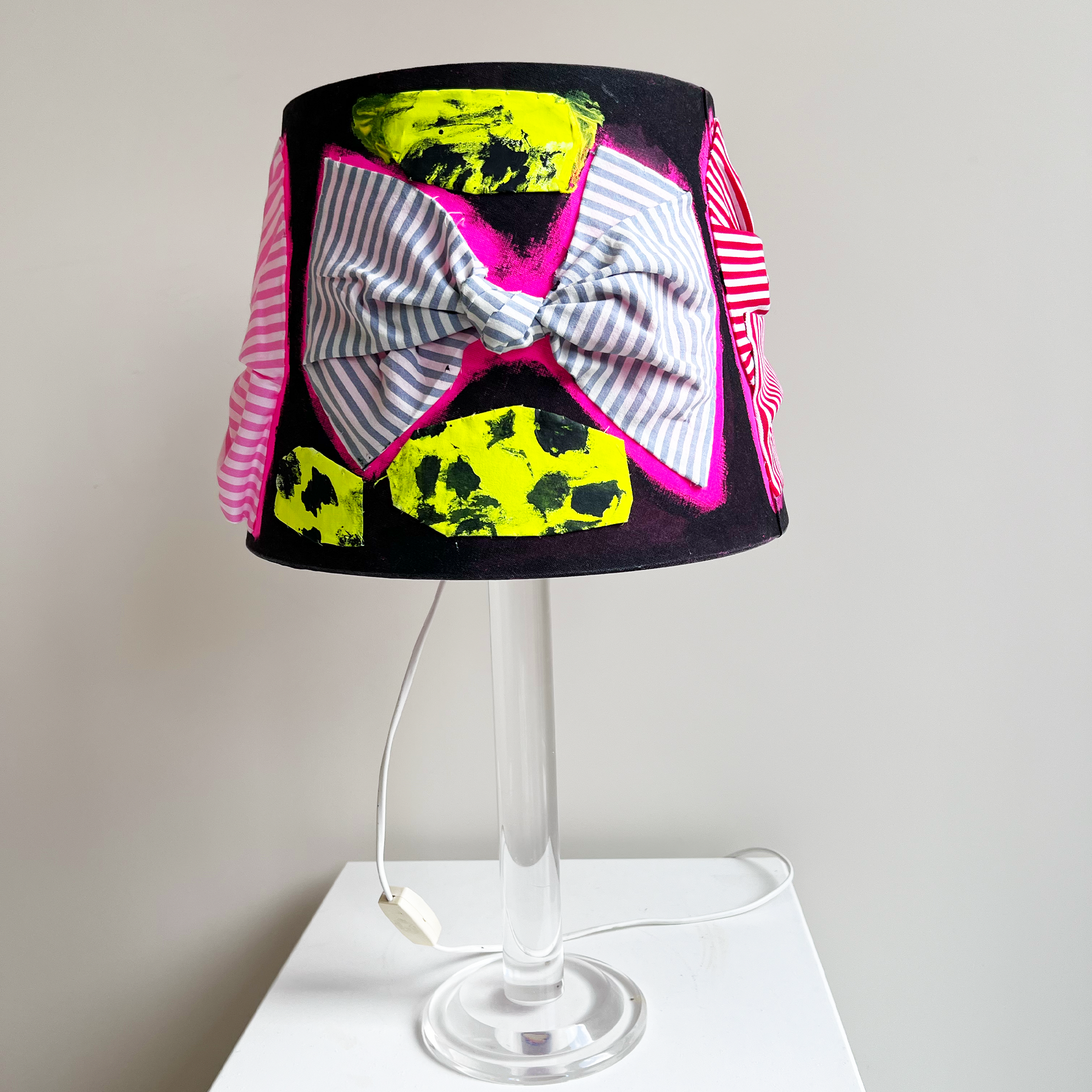 Black lampshade decorated with fluorescent accents and striped bows, all applied by applique technique.