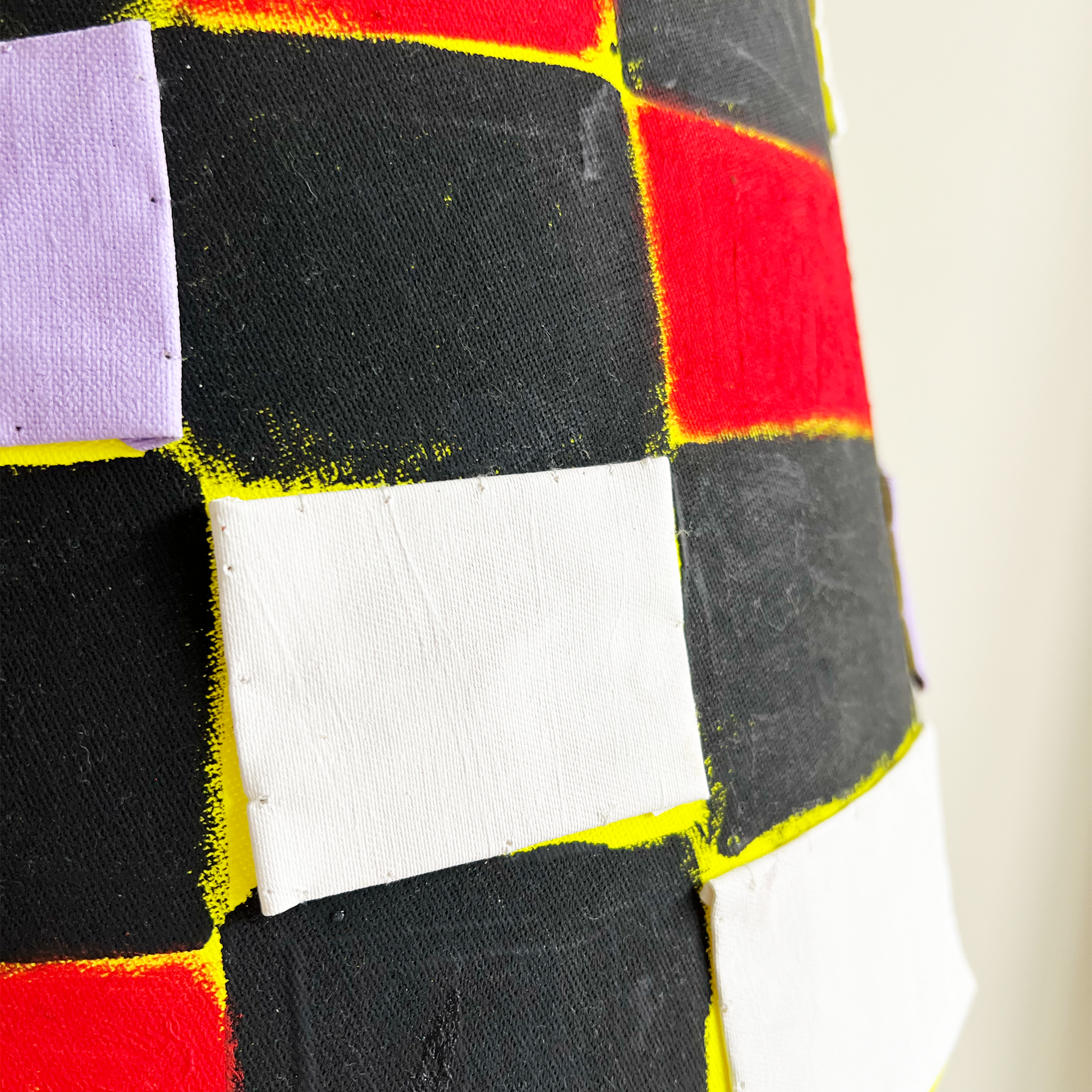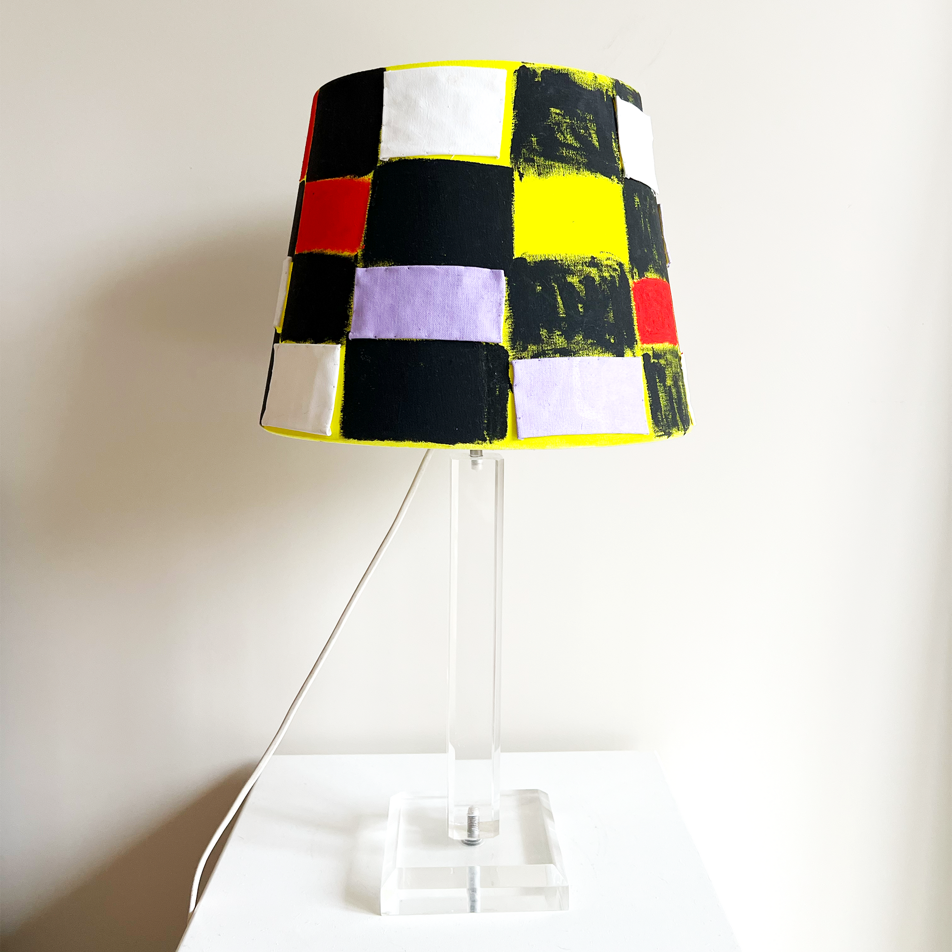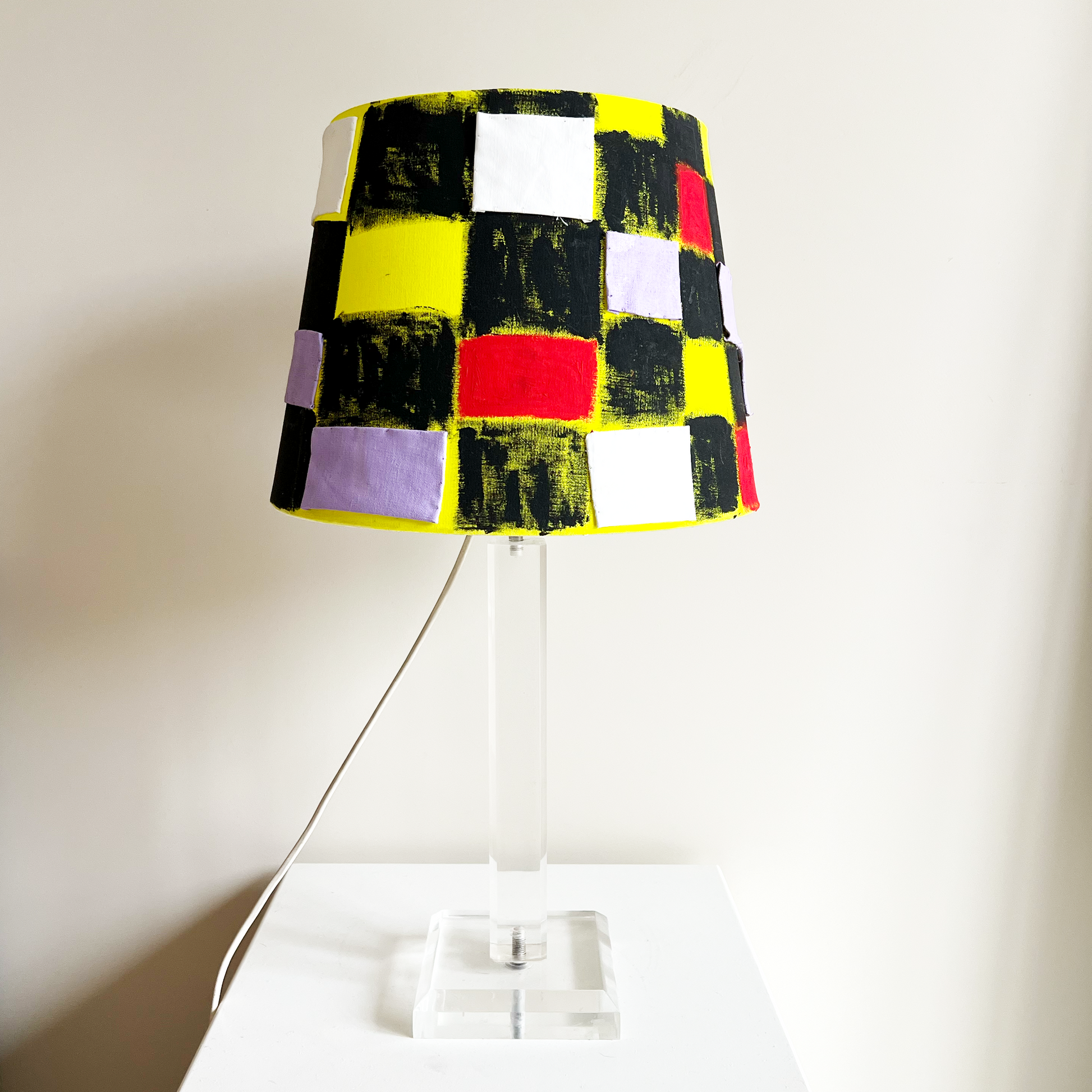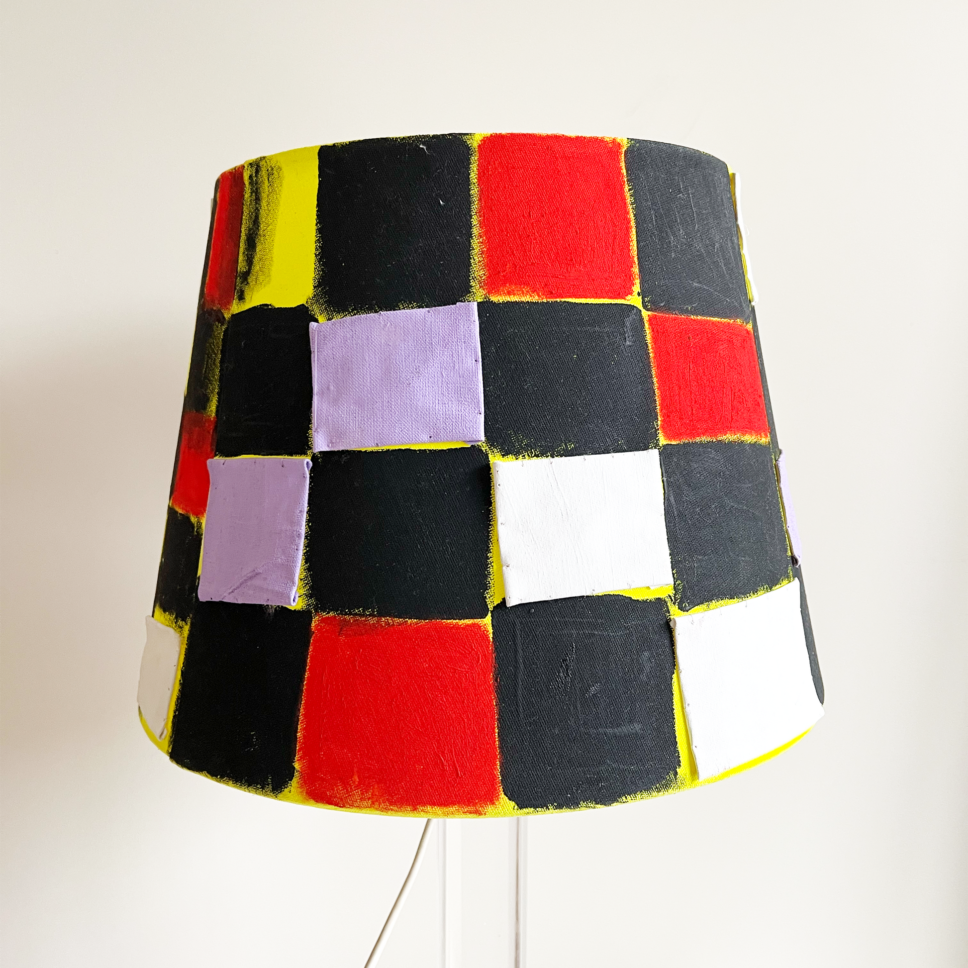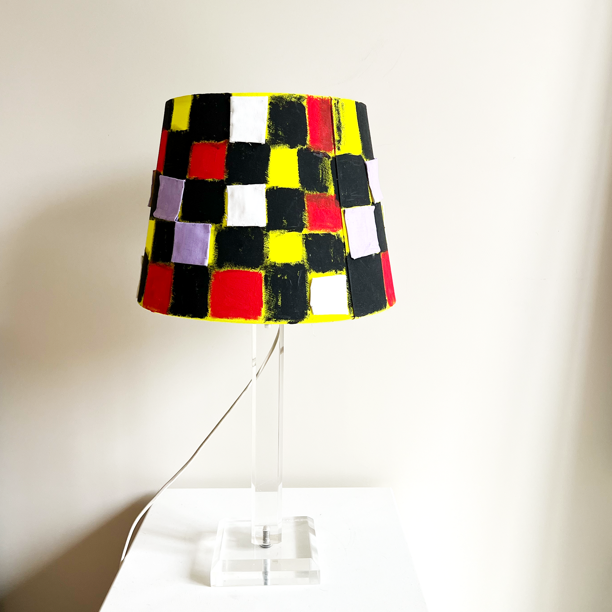 Fluorescent yellow lampshade decorated with checkered pattern textile patches applied by applique technique.