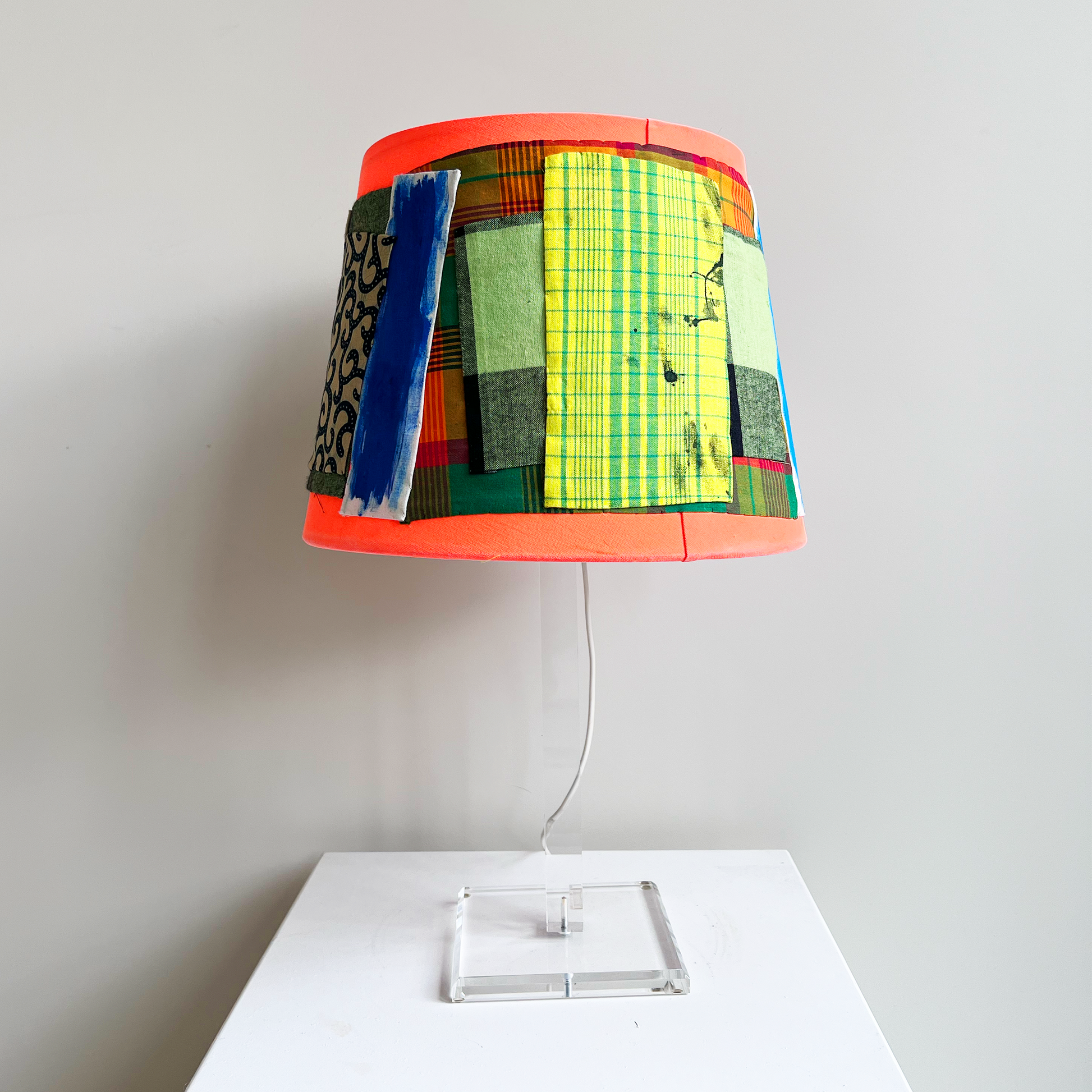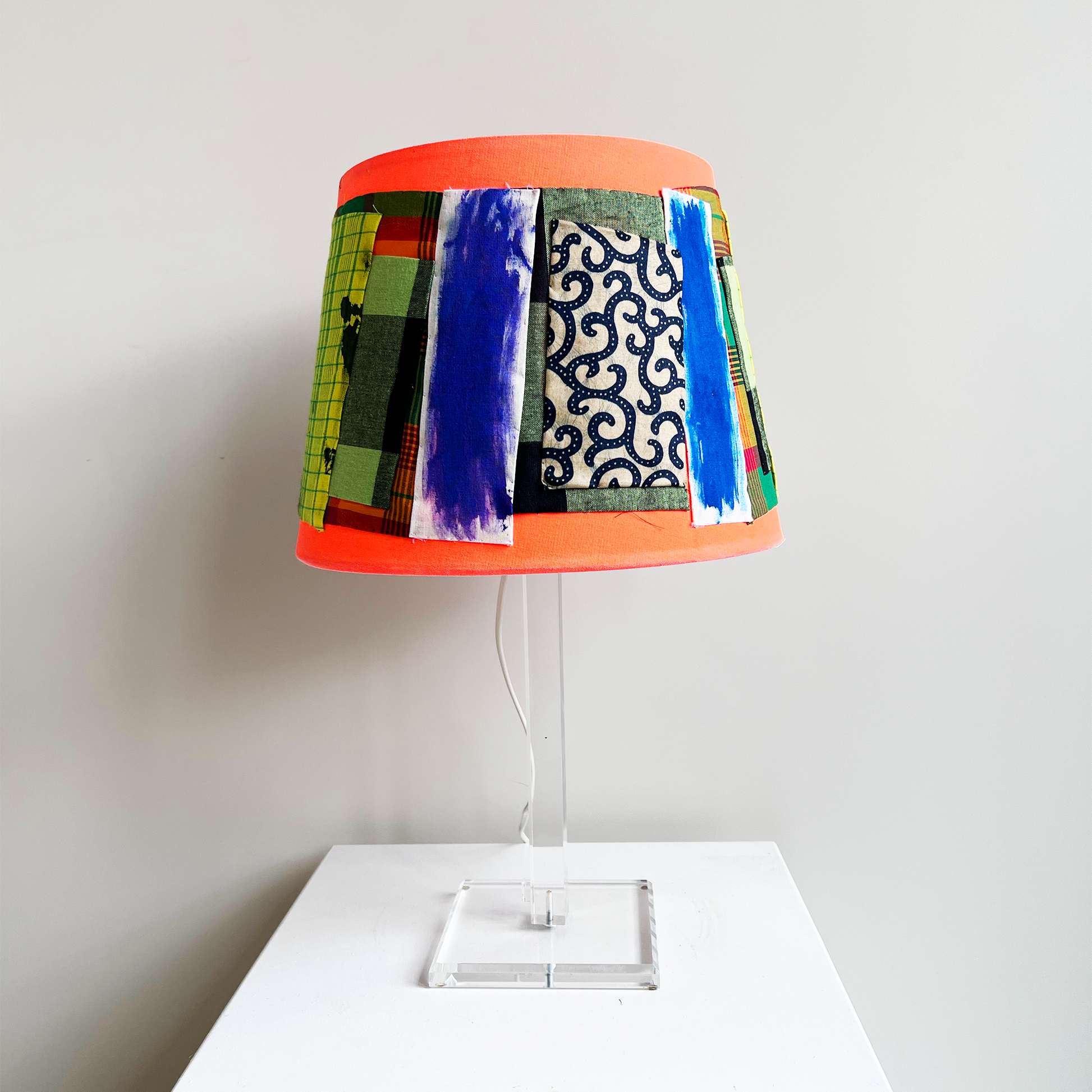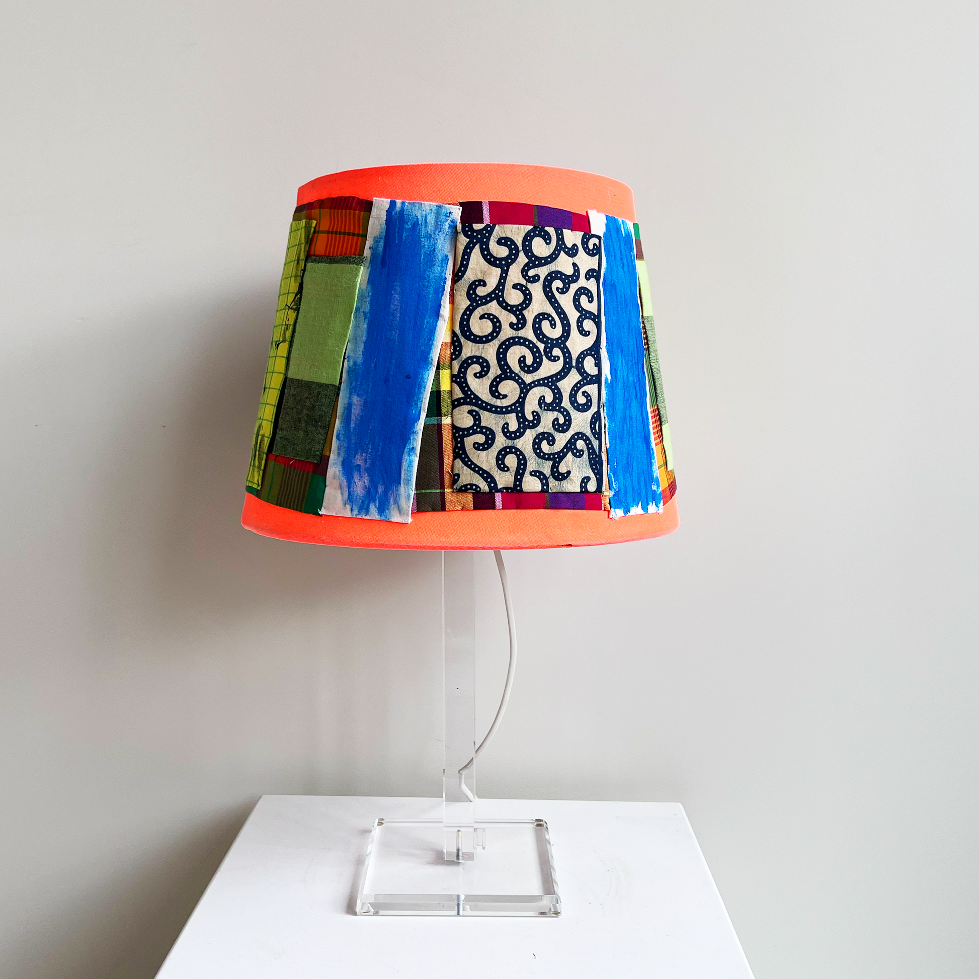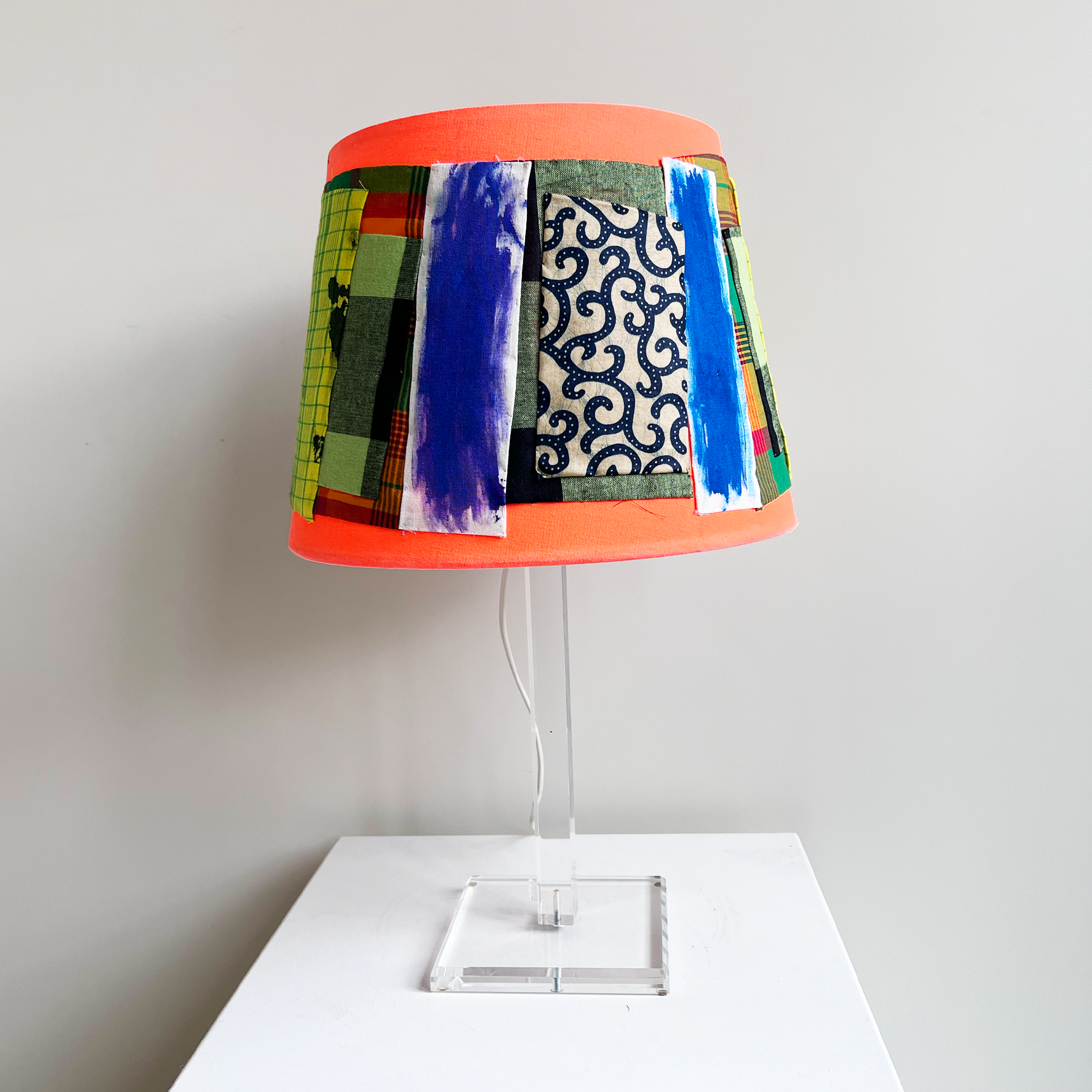 Lampshade decorated with fluorescent orange paint and a variety of hand-painted textiles applied by applique technique.